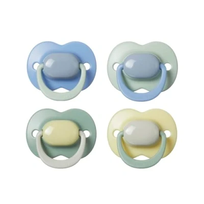 Amazon Comfortable design: With a smooth, curved shield and a symmetrical teat, to comfortably fit your baby's face, any way up​ For every stage: Available in 0-6, 6-18 and 18-36 months​ Trend-led style: These baby dummies come in a range of colour blocked combinations that suit your style, and baby's outfit​ Kind to skin: Air holes on either side to improve air flow and minimise/minimize moisture build-up and skin irritation​ Orthodontic dummy: The vented teat compresses to be gentle on developing teeth and gums Soother clip compatible: Use the handle to attach this dummy to a clip, then your baby's clothes, so it won't get lost and will always be easy to reach, and ready to soothe​ BPA-free: Tommee Tippee soothers are always BPA-free