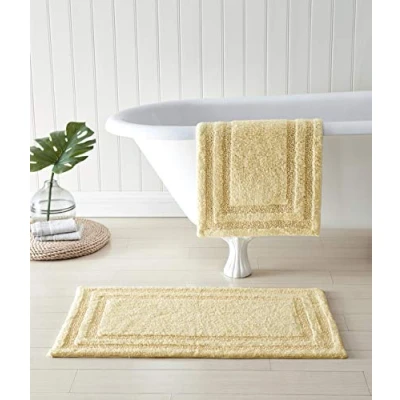 AmazonMATERIAL: 100% Tufted Cotton Construction SET INCLUDES: Two Bath Rugs DIMENSIONS: One Bath Rug- 17"L x 24"W, One Bath Rug- 21"L x 34"W FEATURES: Highly Absorbent and Low Linting; Available in Several Gorgeous Colorways CARE: Machine Wash Cold, Tumble Dry- Easy Care
