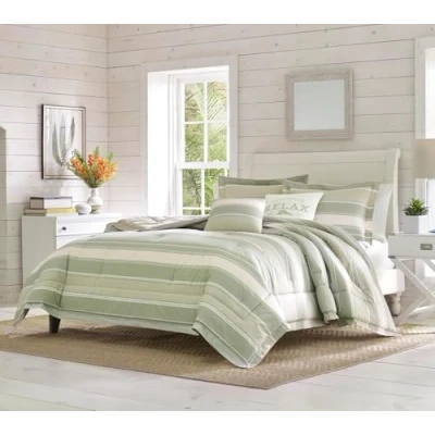 MATERIAL: 100% Cotton Construction- with a soft and breathable feel SET INCLUDES: One Comforter (96"L x 92"W), Two Standard Shams (21"L x 27"W) and Two Throw pillows (18"L x 18"W) and (16"L x 16"W) FILL: Comforter features a polyester fill FEATURES: Comforter is fully reversible for an alternative look DESIGN: Constructed with quality cotton, the Serenity Stripe 5 Piece Comforter Set features a green stripe design, coordinating shams and one of the decorative pillows. The other included decorative pillow features the signature Tommy Bahama logo and the mantra "Relax" in green on the white ground Special Features - All season comfort, medium weight Sham features two piece back closure for easy removal Includes two bonus throw pillows to help create an easy layered look Guest bedroom bedding option This simple, modern stripe design feels casual with a relaxing aesthetic