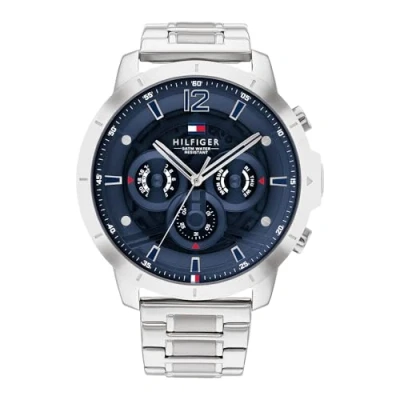 Multifunction Quartz movement with three subeyes Case thickness 12.40mm / Case Diameter 50mm Navy blue dial with stainless steel accents Stainless steel bracelet Water Resistance: 5ATM It may be worn while showering or swimming, but not scuba diving