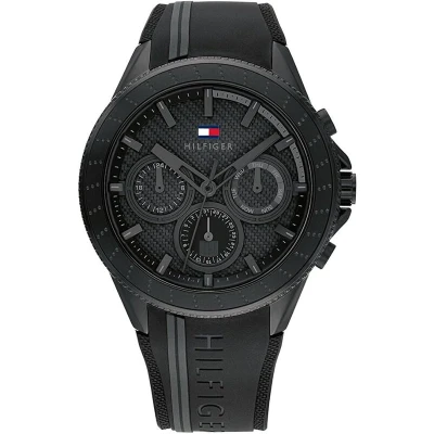 The Tommy Hilfiger 1791861 Black Analogue Multifunction Quartz Watch features a robust 45mm stainless steel case, a textured white carbon fiber dial, and a comfortable white silicone strap. With multifunction quartz movement and 5 ATM water resistance, it's a stylish and durable choice for everyday wear.