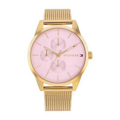 MULTIFUNCTION MOVEMENT FOR WOMEN – Tommy Hilfiger watch featuring day, 24-hour and date sub dials for a relaxed, versatile style with everyday functionality 38MM GOLD STAINLESS STEEL CASE – A 38 mm case in gold stainless steel that offers a sophisticated and contemporary touch BLUSH DIAL WITH SOFT TEXTURE – Blush dial featuring a soft linen texture, CD cut sub eyes and applied stick indexes for a balanced visual harmony GOLD STAINLESS STEEL MESH BRACELET – Gold stainless steel mesh bracelet that wraps the wrist with elegance and femininity 3 ATM WATER RESISTANT – Designed by Tommy Hilfiger to move with you in style, rain or shine