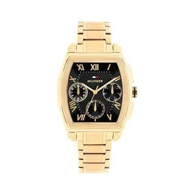 MULTIFUNCTION MOVEMENT – The TH-Oxford watch by Tommy Hilfiger features sub eyes for weekday, date, and 24-hour time, offering refined function for everyday dressing. TONNEAU-SHAPED STAINLESS STEEL CASE (36MM) – The polished stainless steel case showcases a modern tonneau silhouette with shaped pushers and refined detailing. BLACK SUNRAY DIAL WITH OXFORD TEXTURE – The matte black sunray dial is detailed with a center texture inspired by the Oxford shirt, gold-tone Roman numerals, and CD-finished sub eyes. GOLD IP STAINLESS STEEL BRACELET – The five-link bracelet in polished stainless steel features gold Ion Plating (IP) for a bold, refined finish. 3 ATM WATER RESISTANT – Resistant to light splashes and rain. Not suitable for swimming or showering. A sharp gift with everyday sophistication.
