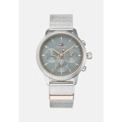 MULTIFUNCTION MOVEMENT – This women’s watch from Tommy Hilfiger features a Japanese multifunction movement with day, date, and 24-hour sub eyes. 34MM STAINLESS STEEL CASE – Slim and polished for everyday wear, with a contemporary 8.2mm profile. SKY BLUE DIAL WITH GOLD DETAILS – The soft sky blue sunray dial features polished gold-tone accents, refined sub-eyes, and a subtle pressed texture. PRESSED MESH BRACELET – The silver-tone pressed mesh bracelet in stainless steel sparkles with subtle texture and is finished with a rose gold Tommy Hilfiger charm bar for a signature touch. 3 ATM WATER RESISTANT – Splash-proof for everyday life. A stylish gift idea with feminine versatility.