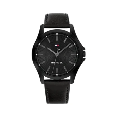3-HAND QUARTZ MOVEMENT FOR MEN – A Tommy Hilfiger watch that stands out for its versatile and easy-to-wear style, perfect for everyday use without sacrificing elegance and precision 43MM BLACK STAINLESS STEEL CASE – A 43 mm stainless steel case with a black finish that adds a sophisticated, contemporary touch for any occasion BLACK DIAL WITH TEXTURED SUNRAY EFFECT – The black dial features a refined sunray effect finish with texture, stick indexes, and Tommy Hilfiger’s iconic “T” sweep BLACK LEATHER STRAP – Black leather strap that gently wraps the wrist with character, perfect for a casual look with refined essence 3 ATM WATER RESISTANCE – A Tommy Hilfiger design that combines style and functionality to accompany you even on rainy days or while washing your hands