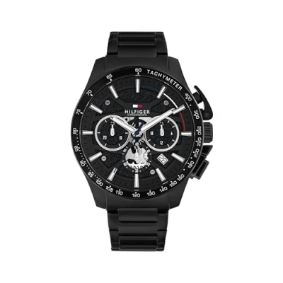 CHRONOGRAPH MOVEMENT – This Tommy Hilfiger men’s chronograph watch features Japanese precision and bold sport styling inspired by racing culture 44MM STAINLESS STEEL CASE – A statement-making silhouette with a black aluminum bezel and an 11.3mm profile for modern comfort. SKELETON BLACK DIAL – Multi-layered texture with branded sub-eyes, bold hands and red accents for a confident, dynamic look BLACK IP BRACELET – The matte black IP bracelet delivers a sleek, all-black finish that enhances the bold character of this men’s chronograph watch. 5 ATM WATER RESISTANT – Built for everyday durability. Splash-ready and perfect for gifting or completing a sport-driven look.
