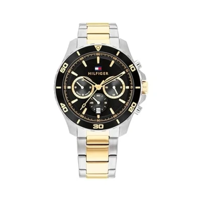 Multifunctional Precision: Engineered for the modern man, this watch boasts a multifunctional movement with three elegantly designed sub-eyes. Offering a blend of style and functionality, it's a statement piece for those who appreciate precision. Case thickness 11.1mm / Case Diameter 43mm Dynamic Black Dial: Elevate your casual and sporty style with this men's watch featuring a vibrant black dial, accentuated with distinctive Tommy Hilfiger branding. 316L Stainless Steel Bracelet with Yellow Gold Ion Plating: Elegant and durable, the watch features a meticulously crafted 316L stainless steel bracelet with yellow gold ion plating, combining style and resilience for a sophisticated wristwear experience. Water Resistance: 5ATM It may be worn while showering or swimming, but not scuba diving