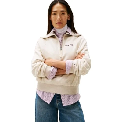 Tommy Hilfiger Classic Script HALF ZIP Sweatshirt, Women's, Size: Large, Heather oatmilk