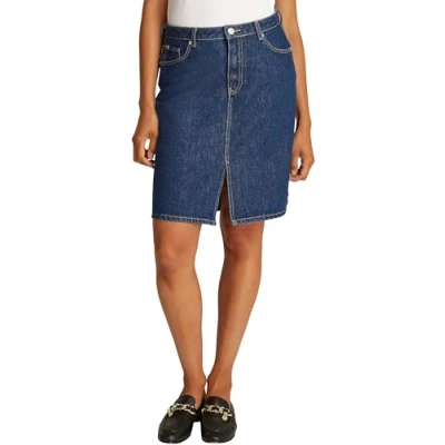 ICONIC & TIMELESS: This original Tommy Hilfiger denim skirt with zip and button fastening comes in a casual design. An embroidered Tommy Hilfiger flag on the back pocket adds the final touch to the look. OPTIMAL FIT: This timeless high-waisted denim skirt sits comfortably and doesn't restrict your movement. This straight fit skirt impresses with a premium fabric and feminine cut. FOR EVERY OCCASION: This knee length skirt boasts a 5-pocket style and a supremely comfortable fit, making it the perfect choice for a smart casual outfit. MATERIAL & CARE: The skirt is made from 50% regenerative cotton, 30% recycled cotton and 20% cotton. It is machine washable and suitable for the tumble dryer. PROVEN QUALITY: The designer brand has been captivating the global fashion industry with its high-quality and lightweight designs in a wide range of styles in its famous dark blue, white and red colours since 1985.