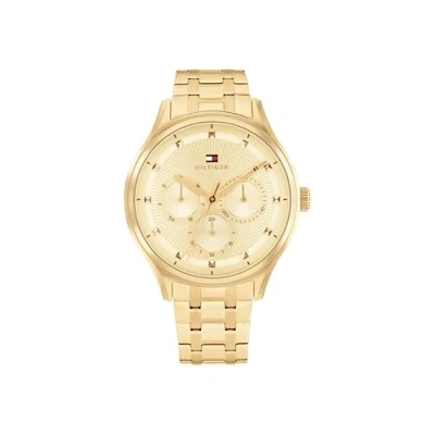 MULTIFUNCTION QUARTZ MOVEMENT FOR WOMEN – Sophistication with attitude and confidence in every detail thanks to subdials for weekday, 24-hour format, and date, reflecting Tommy Hilfiger’s distinctive and bold style 38MM GOLD STAINLESS STEEL CASE – Golden elegance with urban character in a 38 mm case that offers presence without losing lightness or femininity GOLD MULTI-TEXTURED SUNRAY DIAL – Gold dial with varied textures, pyramid-shaped applied markers, decorative rings around the subdials, and a distinctive line on the minute hand that adds personality GOLD STAINLESS STEEL BRACELET – Gold bracelet with integrated links providing a modern and sophisticated touch, reflecting Tommy Hilfiger’s unique style 3 ATM WATER RESISTANT – Perfect for everyday wear, resists splashes and light rain without compromising style or sophistication