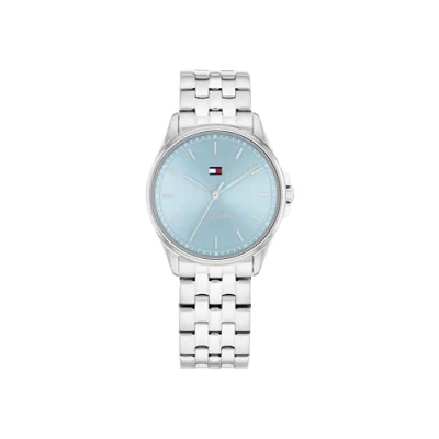 3-HAND QUARTZ MOVEMENT FOR WOMEN – Tommy Hilfiger watch delivering precision and simplicity with a timeless design that complements any style with elegance and versatility 30MM STAINLESS STEEL CASE WITH 8MM THICKNESS – Perfect size combining durability and femininity for a sophisticated look suitable for any occasion GLACIAL BLUE DIAL WITH SUNRAY EFFECT – Dial features applied stick indexes and the colorful Tommy Hilfiger flag at 12 o’clock, adding a touch of sophistication and unique style INTEGRATED STAINLESS STEEL BRACELET – Flawless design ensuring comfort and durability, perfectly reflecting the modern and elegant spirit of the brand 3 ATM WATER RESISTANT – Ideal for daily wear, protects against splashes and light rain, designed for the active woman who never compromises on style