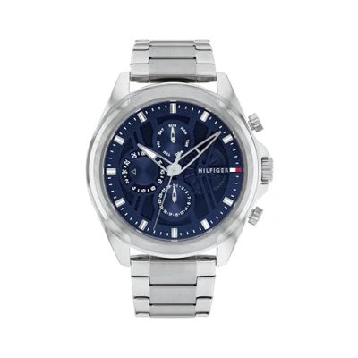 Multifunction Quartz Movement: Equipped with a reliable multifunction quartz movement, featuring sub-eyes for weekday, 24-hour, and date, for seamless functionality in a stylish design. Supersized Case Dimensions: This bold, oversized watch boasts a 48mm case diameter and 11.7mm thickness, creating a striking wrist presence that makes a strong style statement. Dimensional Blue Dial: The blue double-layer dial features bold, oversized hands and multifunction sub-eyes at 12, 6, and 9 o'clock, along with a distinctive Tommy Hilfiger flag logo that adds branded flair. Stainless Steel Bracelet: Completed with a sleek stainless steel bracelet, this timepiece merges durability with a rugged elegance, ideal for the modern, adventurous man. Water Resistance: 5ATM It may be worn while showering or swimming, but not scuba diving