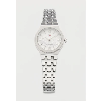 THREE-HAND MOVEMENT – A minimalist women’s watch from Tommy Hilfiger with a clean three-hand display for everyday elegance. 25MM STAINLESS STEEL CASE – Featuring a luxury-inspired geometric bezel and polished lines for a refined, modern look. SILVER-TONE FROSTED DIAL – The frosted dial in silver is enhanced with faceted stick indexes and a touch of sparkle, finished with Tommy branding. INTEGRATED STAINLESS STEEL BRACELET – The sleek link bracelet blends seamlessly into the case for a streamlined, wrist-hugging fit. 3 ATM WATER RESISTANT – Resistant to rain and splashes, but not suitable for showering or swimming. A chic gift for every occasion.
