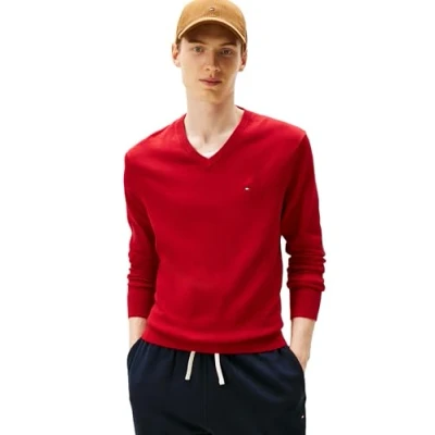 Tommy Hilfiger Men's Cotton Solid V Neck Sweater Lightweight Pullover, Medium red, S