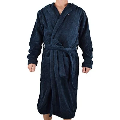 ICONIC & TIMELESS: The original Tommy Hilfiger bathrobe for the spa or at home is characterised by its comfort and durability. The embroidered Tommy Hilfiger flag on the chest and the appliqué pockets complete the look. IDEAL FIT: The timeless design of this minimalist bathrobe with hood flatters any body shape. The waist belt creates an attractive silhouette. SOFT MATERIAL: Pure cotton was used to ensure a cosy feel. The fluffy towelling wraps around your body for instant relaxation. PREMIUM MATERIAL: The bath robe is made from 100% cotton. PROVEN QUALITY: The designer brand has been captivating the global fashion industry with its high-quality and lightweight designs in a wide range of styles in its famous dark blue, white and red colours since 1985.