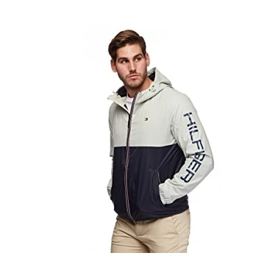 FUNCTIONALITY: Center front red, white, and navy tricolor zipper closure; Two lower welt pockets at sides; Interior zipper pocket for additional storage STYLISH FEATURES: Attached hood with adjustable draw cords for comfortability; Hilfiger name along left arm; Tommy Hilfiger logo on left chest; contrasting lining in hood TEXTILE TECHNOLOGY: 100% nylon outer shell allows the jacket to be water resistant protecting against varying weather conditions