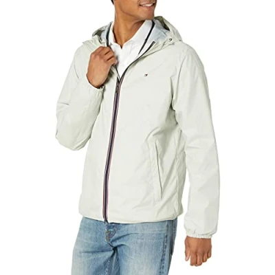 Tommy Hilfiger Men's Lightweight Active Water Resistant Hooded Rain Jacket, Ice, XXL