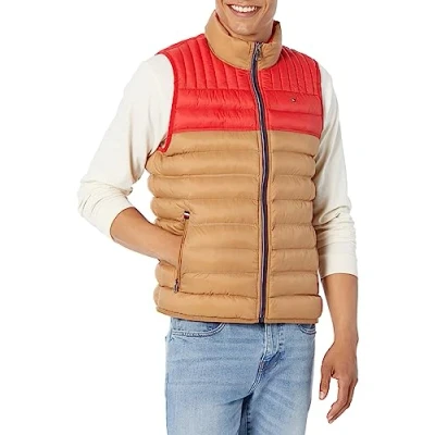 Tommy Hilfiger Men's Lightweight Packable Puffer Vest, Khaki/Red Colorblock, M