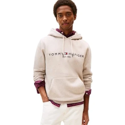 Tommy Hilfiger Men’s Logo Hoodie, Beige (Heathered Pebble), M