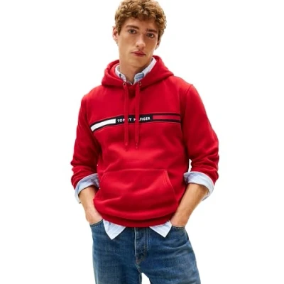 Tommy Hilfiger Men's Weight Fleece Hoodie Sweatshirt with Signature Stripe Logo Hooded, Medium Red, S