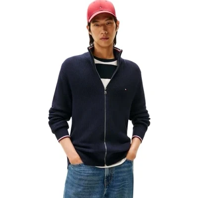 Tommy Hilfiger Men’s Zip Through Ribbed Jumper with Stand Collar, Blue (Desert Sky), XL
