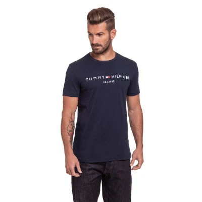 Secret SalesMens Tommy Hilfiger Logo T- Shirt in navy.- Crewneck.- Short sleeves.- Embroidered Tommy Jeans flag logo at left sleeve.- Tommy Hilfiger logo at centre chest.- Soft cotton jersey construction.- Regular fit.- 100% Cotton. Machine wash at 30 degrees.- Ref: MW0MW11465403