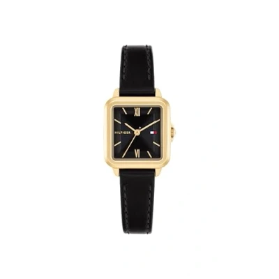 3-HAND QUARTZ MOVEMENT FOR WOMEN – A reinvented classic, polished and sophisticated, blending elegance and precision to carry you from casual looks to dressy outfits 24MM X 22.5MM GOLD STAINLESS STEEL CASE WITH 6.6MM THICKNESS – Luxury-inspired design with a delicate shape that enhances femininity and Tommy Hilfiger style BLACK SUNRAY DIAL – Features Roman numerals and indexes, along with a circular textured outer zone that adds depth and style BLACK LEATHER STRAP – Soft and natural, the black leather strap adds elegance and a timeless touch for any occasion 3 ATM WATER RESISTANT – Designed to confidently accompany you daily, protecting your Tommy Hilfiger watch from splashes and light rain