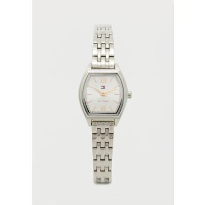 TWO-HAND MOVEMENT – A timeless women’s watch from Tommy Hilfiger, featuring a minimalist two-hand display that blends simplicity and style. TONNEAU-SHAPED STAINLESS STEEL CASE (21.5 x 22MM) – The mini case in polished stainless steel is designed with a soft tonneau silhouette for a sophisticated dress look. SILVER-WHITE SUNRAY DIAL WITH ROSE GOLD ACCENTS – The dial combines a silver-white sunray finish with Roman numerals and rose gold-tone stick indexes for elevated contrast. STAINLESS STEEL BRACELET – A polished stainless steel link bracelet completes the look with a classic touch of shine. 3 ATM WATER RESISTANT – Splash-resistant for daily wear. Not suitable for showering or swimming. A thoughtful gift with lasting appeal.