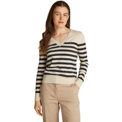 ICONIC & TIMELESS: This original Tommy Hilfiger jumper impresses with its classically elegant yet simple design. The pretty V-neckline makes this a classic piece. OPTIMAL COMFORT: The flattering cut of this jumper will help you feel your best. This knitted top is neither too thick nor too thin, making it perfect for both the transitional seasons and winter. FOR ANY OCCASION: This elegant classic is comfortable to wear and versatile to combine into outfits. The result is a jumper perfect for the office, evenings or everyday wear. MATERIAL & CARE: The jumper is made from 67% organic cotton and 33% polyamide. It is machine washable and suitable for the tumble dryer. PROVEN QUALITY: The designer brand has been captivating the global fashion industry with its high-quality and lightweight designs in a wide range of styles in its famous dark blue, white and red colours since 1985.