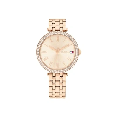 3-hand quartz movement for women - feminine and timeless elegance with a classic design that keeps pace with every moment of the day in style and precision 34mm rose gold stainless steel case with crystal bezel - modern and elegant design featuring a bezel adorned with two rows of crystals that emit a subtle, feminine sparkle Rose gold stainless steel dial with sunray effect - the dial with rose gold finish, sunray effect, and roman numerals creates an elegant play of light highlighting the essence of Tommy Hilfiger Rose gold stainless steel bracelet - t-bar integration combining comfort, freshness, and a glamorous touch for any occasion 3 atm water resistance - designed to fit her daily routine while maintaining charm and distinction even on rainy days