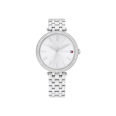 3-HAND QUARTZ MOVEMENT FOR WOMEN – Feminine and timeless elegance with a classic design that keeps pace with every moment of the day in style and precision 34MM STAINLESS STEEL CASE WITH CRYSTAL BEZEL – Modern and elegant design featuring a double row of crystals on the bezel that add subtle, feminine sparkle SILVER DIAL WITH SUNRAY EFFECT – The radial sunray dial with Roman numerals creates an elegant play of light that highlights the essence of Tommy Hilfiger STAINLESS STEEL BRACELET – T-bar integration combines comfort, freshness, and a sophisticated touch for any occasion 3 ATM WATER RESISTANCE – Designed to fit her daily routine while maintaining charm and distinction even on rainy days