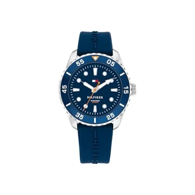 3-HAND QUARTZ MOVEMENT FOR YOUTH – Tommy Hilfiger delivers a modern, sporty watch ideal for those seeking precision and youthful freshness 36MM STAINLESS STEEL CASE WITH 9.20MM THICKNESS – Featuring a blue aluminum bezel, sporty details, and a coin edge that highlights urban elegance and daily durability SEMI-MATTE BLUE DIAL – Design with dot and stick indexes that add character and ensure clear readability at any time BLUE SILICONE STRAP WITH HILFIGER ENGRAVING – Comfortable and flexible, this strap offers durability and a modern look that keeps pace with an active lifestyle 10 ATM WATER RESISTANT – Perfect for daily activities and light water sports, this Tommy Hilfiger watch guarantees style and worry-free functionality