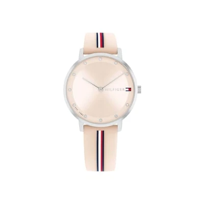 2-HAND QUARTZ MOVEMENT FOR WOMEN – A minimalist and sophisticated watch offering timeless precision to accompany your style every day 34MM STAINLESS STEEL CASE – A sleek stainless steel case delivers a modern and versatile style with the distinctive Tommy Hilfiger signature BLUSH SUNRAY DIAL WITH CRYSTAL INDEXES AND CD TEXTURE OUTER RING – A luminous dial with crystal markers and a textured outer ring for a refined, standout look BLUSH SILICONE STRAP – Soft and comfortable, featuring Tommy Hilfiger’s iconic red, white, and blue stripes that add a fresh, modern touch for an urban style full of personality 3 ATM WATER RESISTANCE – Perfect for city pace, this Tommy Hilfiger watch keeps you stylish even on light rainy days