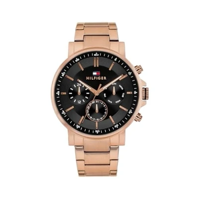 MULTIFUNCTION MOVEMENT – A refined men’s watch from Tommy Hilfiger with day, date, and 24-hour sub eyes, designed to elevate your everyday style. MULTIFUNCTION MOVEMENT – A refined men’s watch from Tommy Hilfiger with day, date, and 24-hour sub eyes, designed to elevate your everyday style. BLACK SUNRAY DIAL WITH BROWN IP DETAILS – The black sunray dial is enhanced with CD-textured sub eyes and tonal brown IP accents, blending sleek design with subtle contrast. BROWN IP STAINLESS STEEL BRACELET – The link bracelet in stainless steel with brown Ion Plating offers a warm, refined take on modern monochrome styling. 5 ATM WATER RESISTANT – Rain and splash-ready, and suitable for swimming. Not recommended for showering or submersion.