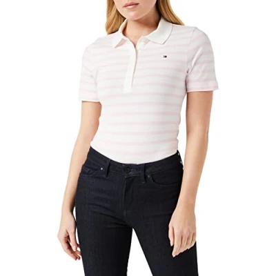 Tommy Hilfiger Women 1985 Slim Piqué Short Sleeve Polo Shirt Fit, White (Breton Stripes Ecru/Pastel Pink), XL