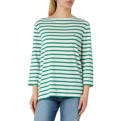 Tommy Hilfiger Women Long Sleeve T Shirt Cotton, Multicolor (Breton Ecru/Olympic Green), 46
