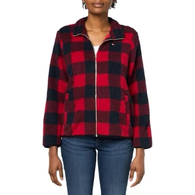 Features: Jacket, sherpa, buffalo check, zipup, long sleeve Tommy Hilfiger flag logo embroirdered on the chest Soft sherpa material creating a cozy pullover Versatile styling: A pair of jeans, denim skirt, yoga pants, spandex workout pants, denim and chino shorts or high-waisted biker shorts