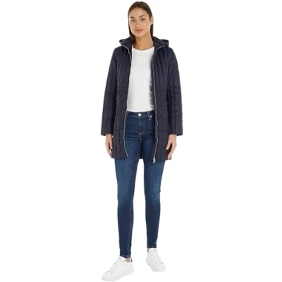 ICONIC AND TIMELESS: the original Tommy Hilfiger padded coat with zip and hood collar has a casual design, the familiar Tommy Hilfiger branding on the sleeve adds a special touch IDEAL FIT: this fitted winter jacket sits extremely comfortably and offers ideal freedom of motion, the timeless coat has a lining that keeps you warm FOR ANY OCCASION: this elegant padded jacket is highly functional and protects you from wind and weather It is a ideal companion for autumn and winter days and suited to everyday wear or travel HIGH-QUALITY MATERIAL: this product is made of recycled polyester (56 percent), polyester pes (44 percent) PROVEN QUALITY: the designer brand has been captivating the global fashion industry with its high-quality and lightweight designs in a wide range of styles in its famous dark blue, white and red colours since 1985