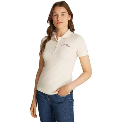 Tommy Hilfiger Women’s Script Graphic Slim Fit Short Sleeve Polo Shirt, Off White (Ivory Petal), M