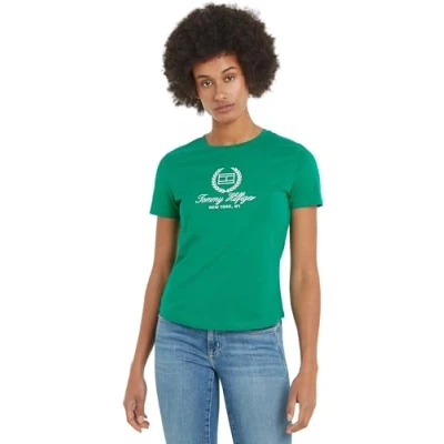 Tommy Hilfiger Women's Slim Flag Script Tee Ss Ww0ww41761 S/S Knit Tops, Green (Olympic Green), XXS