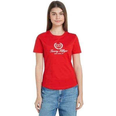 Tommy Hilfiger Women's Slim Flag Script Tee Ss Ww0ww41761 S/S Knit Tops, Red (Fierce Red), XS