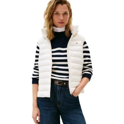 Tommy Hilfiger Women’s Slim Padded Gilet with Hood, White (Ivory Silk), L