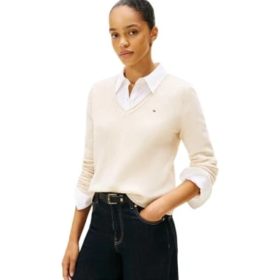 Tommy Hilfiger Women’s Soft Wool V Neck Jumper, Off White (Heather Oatmilk), M