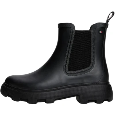 PREMIUM DESIGN: These stylish boots impress with their winterproof design and warm lining. A chunky sole and Tommy Hilfiger branding to the side add the final touches to the shoe. STYLISH & PRACTICAL: These original Tommy Hilfiger ankle boots don't just look great – they’re also supremely comfortable. They keep you warm and are perfect for both office wear and everyday activities. FOR EVERY OCCASION: Team these stylish boots with simple jeans or flowing dresses and skirts. Whatever the season, these shoes will go with any outfit. PREMIUM MATERIAL: The upper is 100% vulcanised rubber. PROVEN QUALITY: The designer brand has been captivating the global fashion industry with its high-quality and lightweight designs in a wide range of styles in its famous dark blue, white and red colours since 1985.