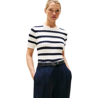 Tommy Hilfiger Women’s Short Sleeve Cable Knit Jumper, Multicolor (Ivory Silk/Dark Night Navy STP), XS