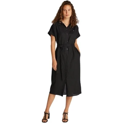Tommy Hilfiger Women’s Short Sleeve Linen Belted Midi Shirt Dress, Black (Black), 14
