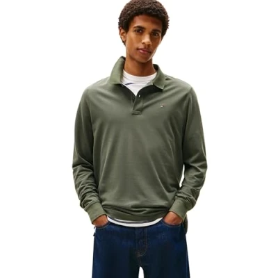 Tommy Jeans Men's Long Sleeve Slim Placket Cotton Polo Shirt, Green (Pewter Green), XXL