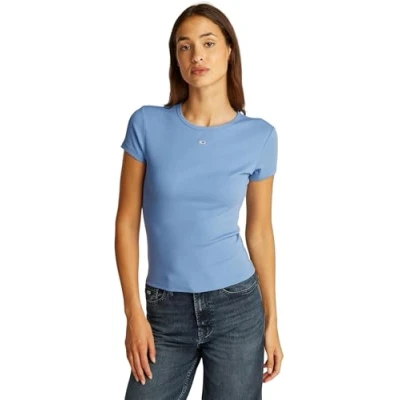 Tommy Jeans Women’s Short Sleeve Essential Rib Slim Fit T Shirt, Blue (Colorado Blue), XL