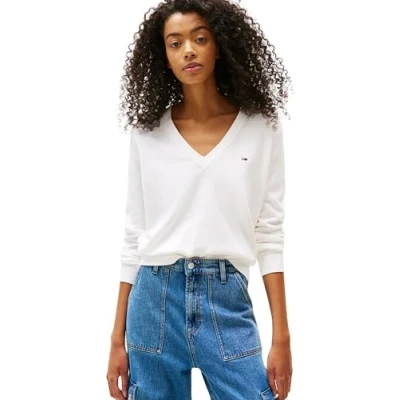 Tommy Jeans Women's TJW Essential Vneck Sweater EXT DW0DW19888 Pullover Sweater, White (Ecru), 6XL