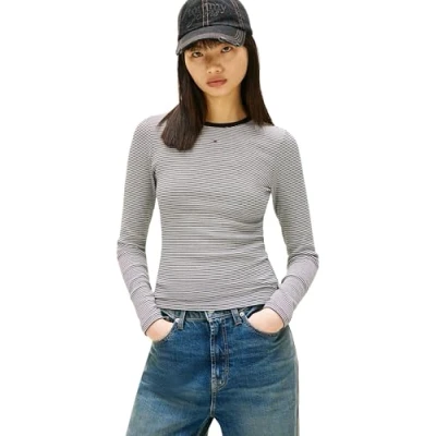 Tommy Jeans Women's TJW Slim Essential Rib LS DW0DW17387 L/S T Shirt, Black (Black/Ecru Stripe), S
